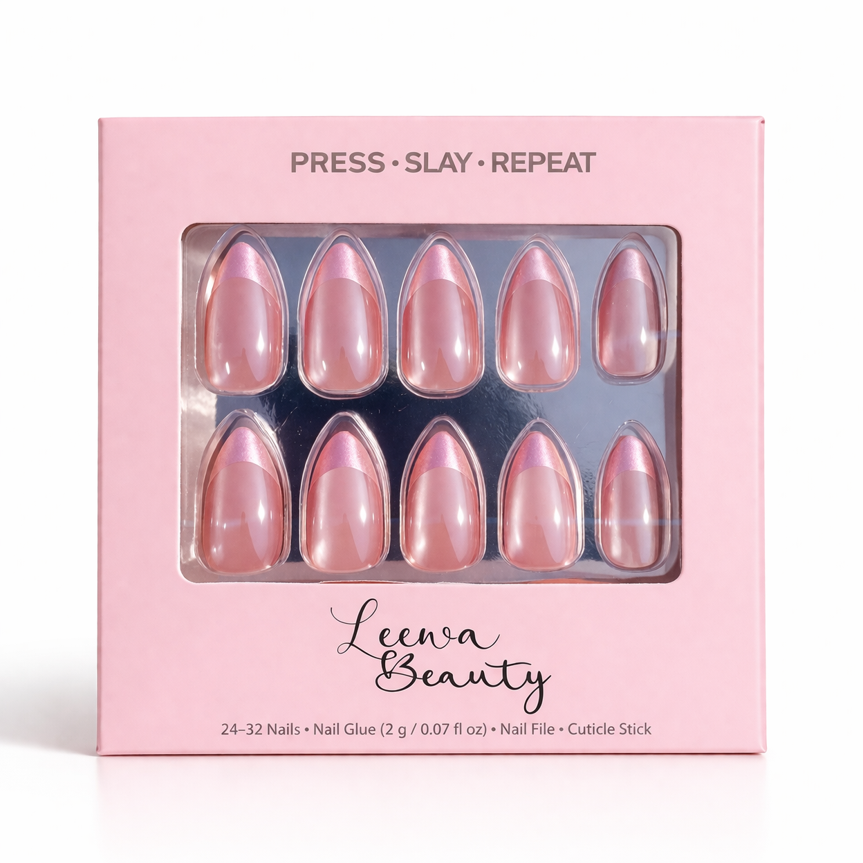 Short almond French nails with nude base. Nails have a silvery pink and purple cat eye sparkle. Nails are water-resistant and adjustable to fit your individual style.