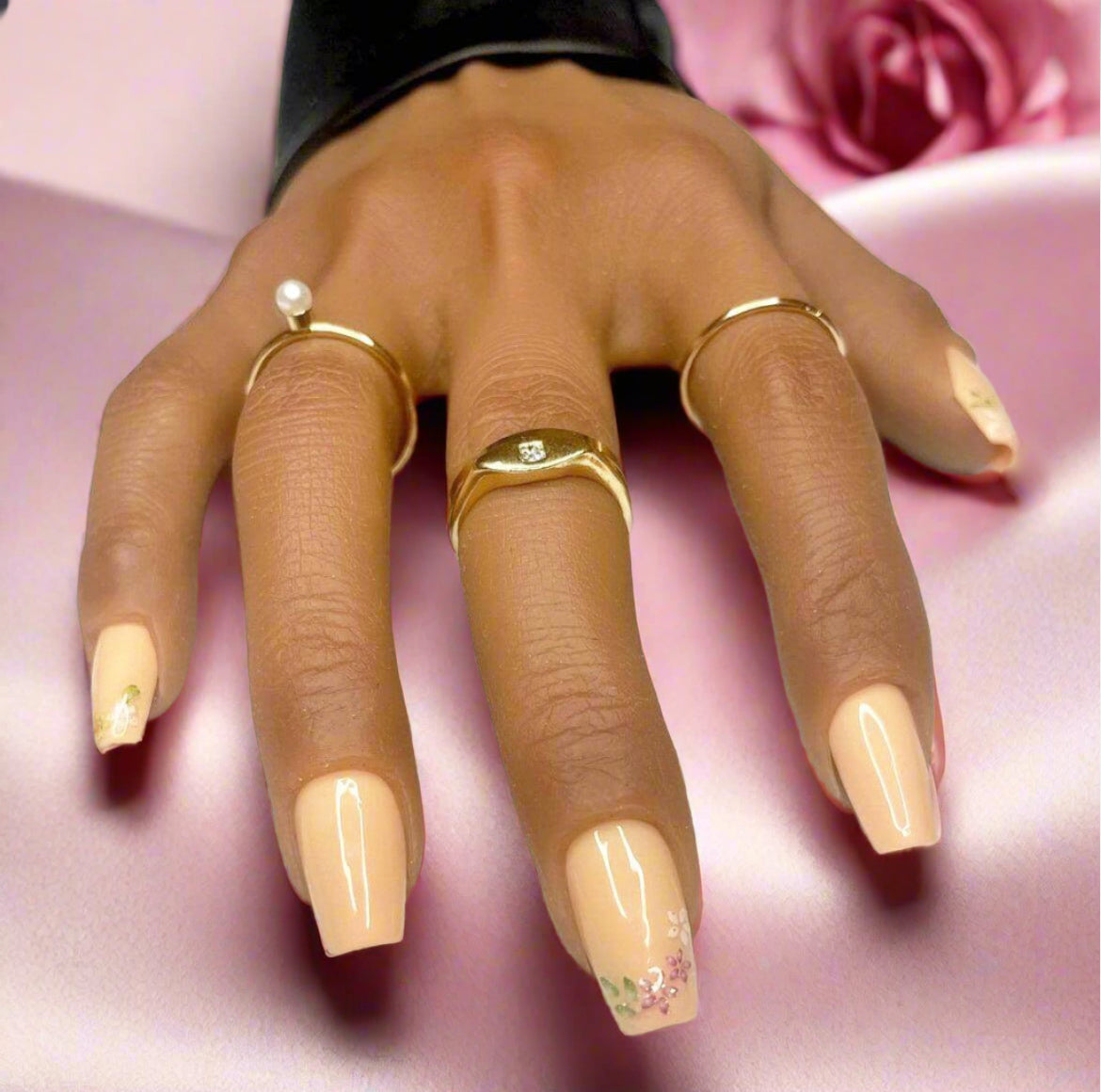Aureate Almond's Medium Reusable Press-on Nails are crafted from soft gel, boasting a stunning nude shade with gold foil and rhinestone accents. With waterproof, customizable and flexible features, these nails can last for up to two weeks or more.