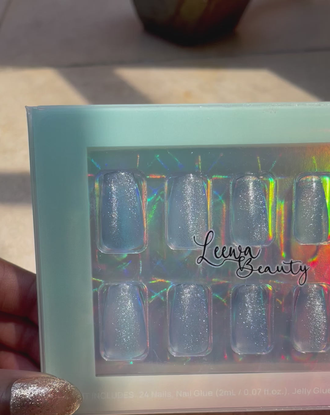 Our Reusable Short Coffin Press Nails make a captivating statement with their striking blue hue and their dazzling silver cat-eye effect.