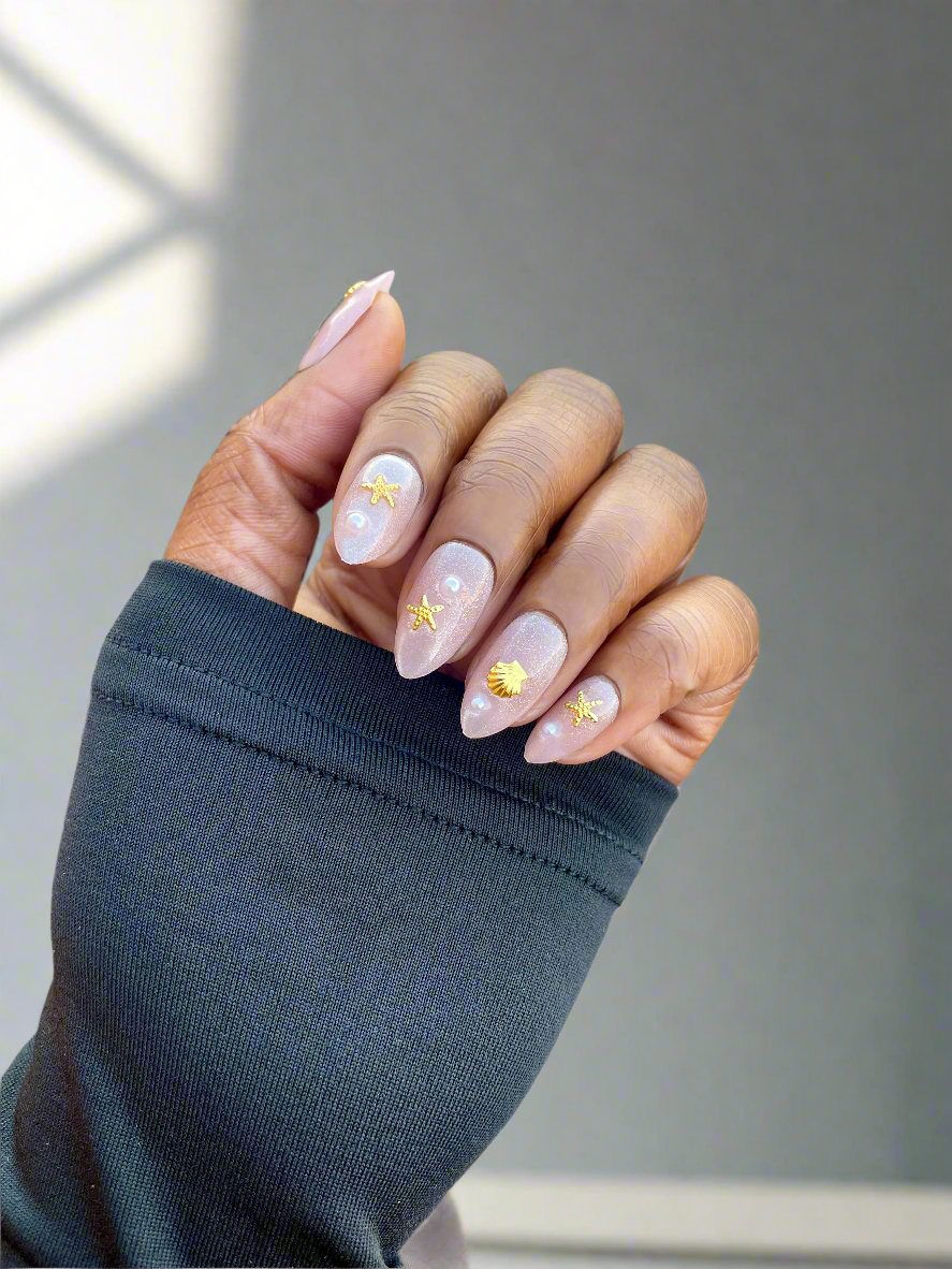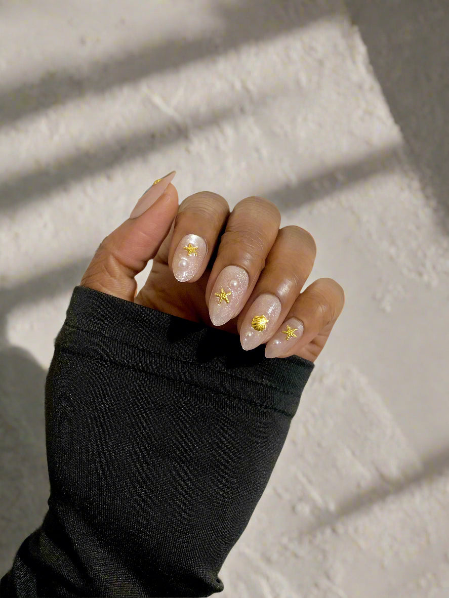 Featuring a delicate light pink cateye base with pearls, gold seashell and star accents. Golden Shore brings vacation vibes to your fingertips- no passport required.