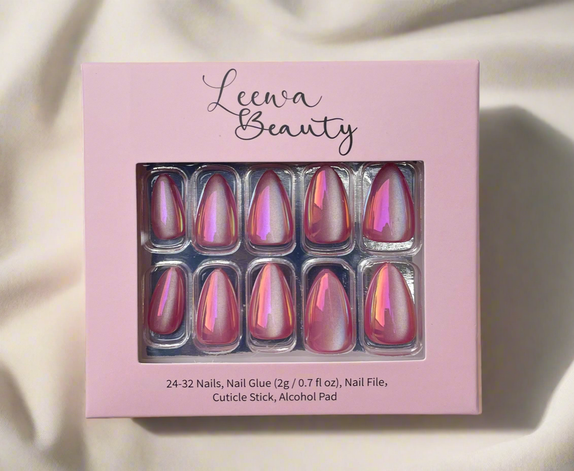 - Clean hands and let dry. Then, utilize the enclosed cuticle stick to push back cuticles, select the right nail for each finger, and set aside. Buff the nail surface with the double-sided file to create some texture. With the alcohol pad from the kit, clean the nail to remove any oil. Apply an even layer of glue (included) to the Leewa Nail and natural nail, placing the Leewa Nail just beneath the cuticle for a natural look. Press for 30+ seconds using your thumb to ensure full coverage and no air pockets; use more glue and pressure if needed. If desired, refine the shape and length of the nails with the enclosed file or nail clipper.