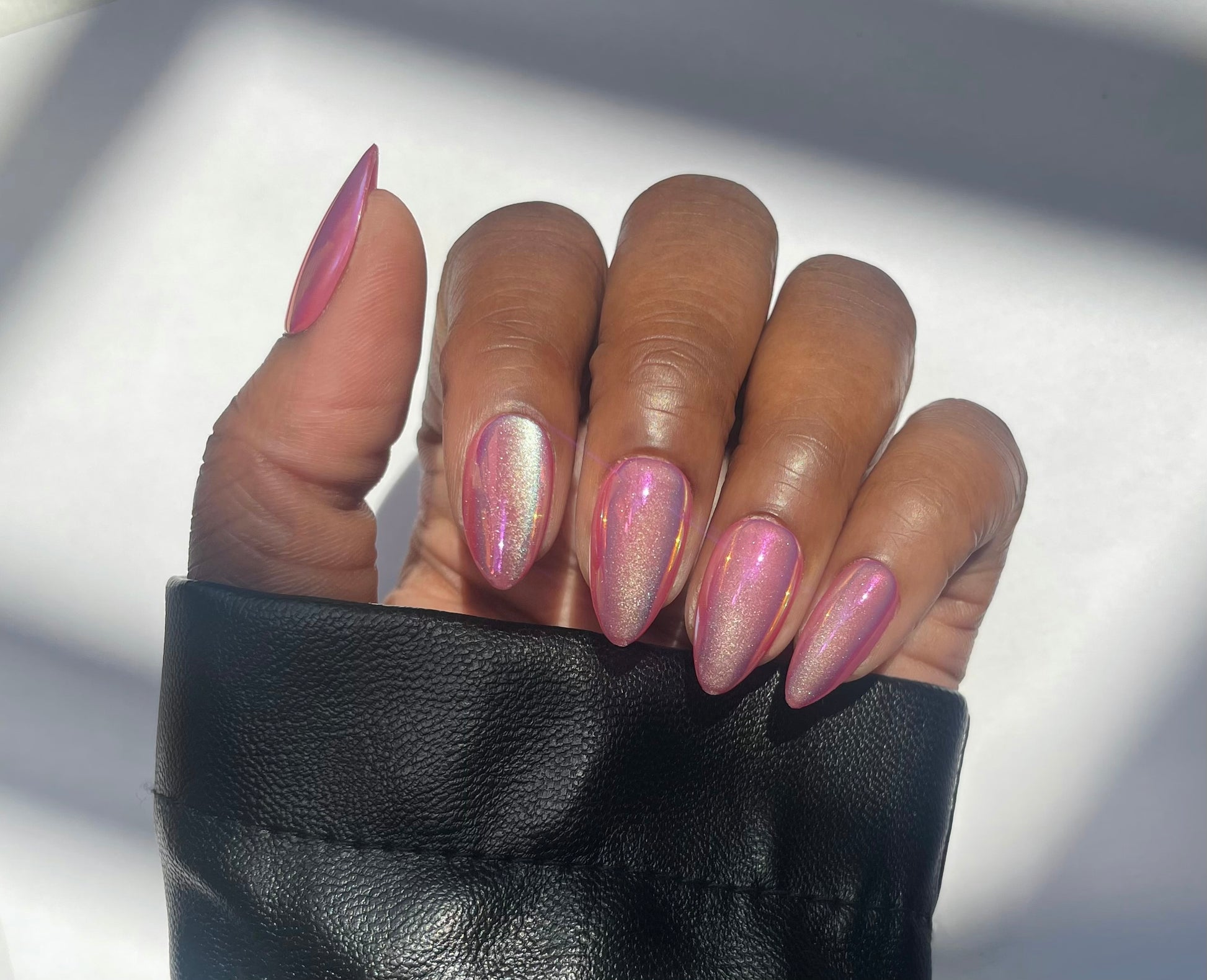 Short almond nails that feature a high-shine, reflective chrome finish in a sleek soft pink hue.